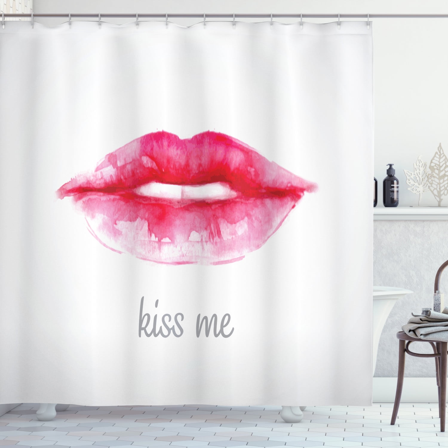 Kiss Shower Curtain Watercolor Style Woman Lips With Pink Lipstick And Kiss Me Quote Fabric Bathroom Set With Hooks 69w X 70l Inches Hot Pink Pale Grey And White By Ambesonne